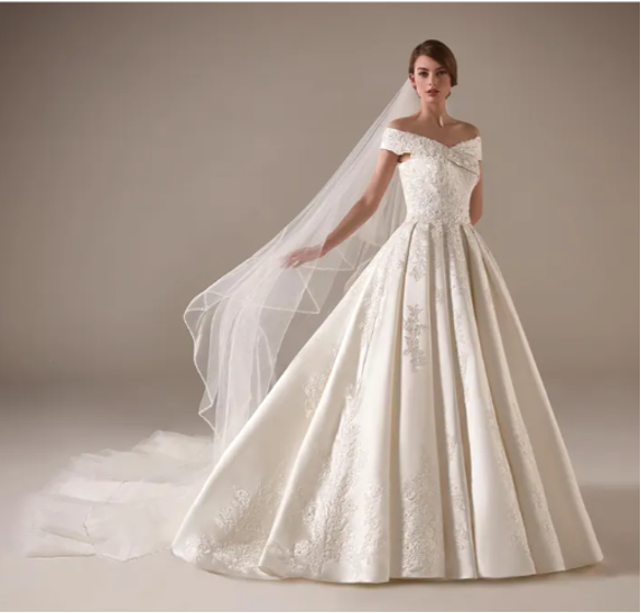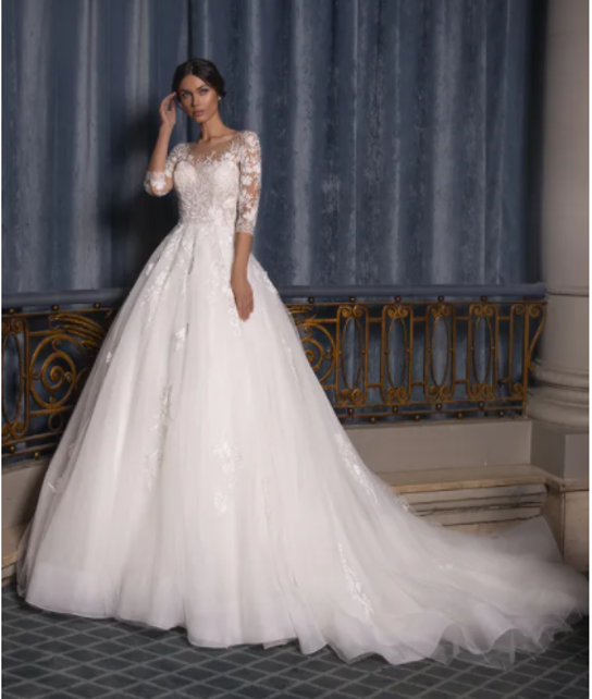 Podría ser un vestido romántico y elegante, corte princesa, corte A, en tejidos nobles. Cuerpo de encaje, guipur, falda de shantung, mikado o incluso también, porque no con superposición de capas de tul.