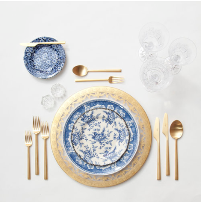 Aquí te muestro un estilo de vajilla azul y oro, para que te inspires.